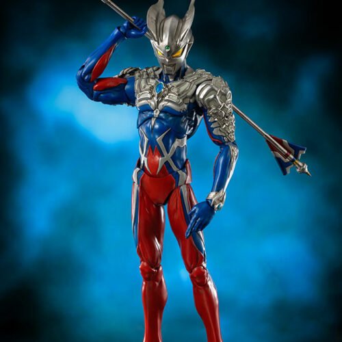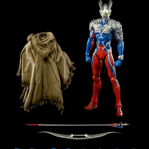 The Akinori Takaki Ultraman Zero collectible figure stands approximately 13.6 inches tall, and is fully-articulated with over 52 points of articulation. The pair of Zero Sluggers on the head can be detached, and attached to the chest with magnets to have Zero take on the Zero Twin Shoot shooting form. Other weapons included in the merchandise is a large bladed Zero Twin Sword weapon and Ultra Zero Lance.