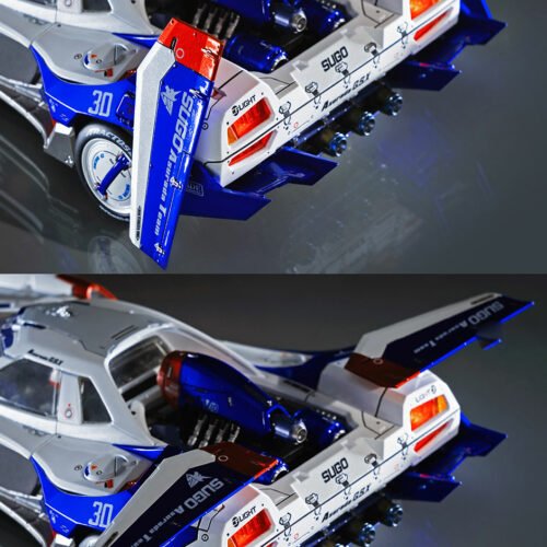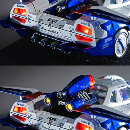 VA Hi-SPEC ASURADA G.S.X is a 1/18 scale collectible die-cast model, with approximate dimensions of 9.5″L x 5″W x 2″H. Its advanced moveable parts include hinged side doors and openable roof, a boost pod lift feature, a pair of rear wings that can be folded/unfolded, a pair of rear hatches that flips open to reveal the interior turbine fans, an opening fuel cover, all four wheels that can revolve, and front wheels that can turn directions.